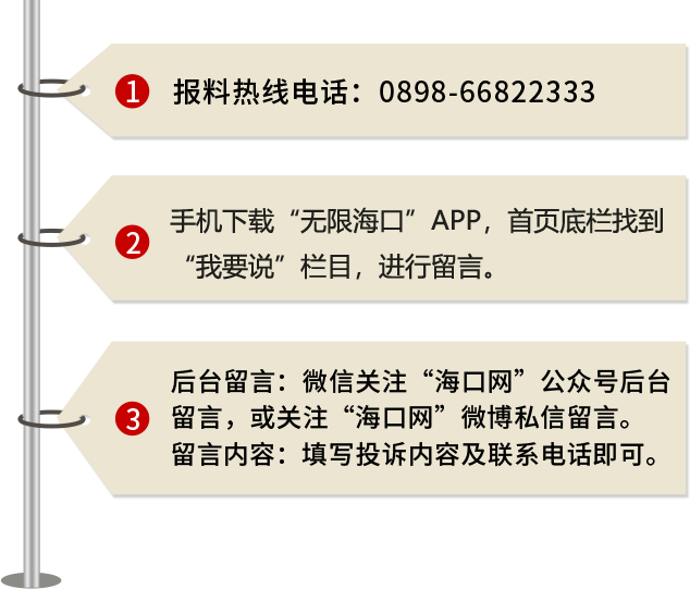 海口網(wǎng)“記者幫幫幫”專欄,面向社會征集鮮活、有料的??诘貐^(qū)新聞線索,我們將安排記者進行核實并跟進報道。你有“料”我有“獎”,我們將根據(jù)報料情況,適當(dāng)給予一定的現(xiàn)金獎勵,歡迎大家踴躍來料。