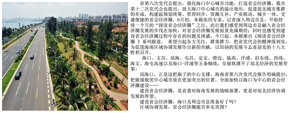 “全面加快以海口為中心的省會經(jīng)濟圈建設(shè)?!笔〉诹吸h代會的聲音甫一落地,在各市縣蕩起一片片思想的浪花。海口要做大做強做優(yōu);市縣要做出自己的特色;是帶動?是承接?是整合?是融入?孰重孰輕,何去何從?瓊北8市縣開始陷入深深的思考,開始了蠶蛹破繭而出之際的思索與行動。